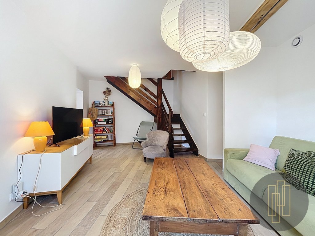 La maison se compose au rez-de-chaussée d'une cuisine ouverte sur le séjour avec accès direct au jardin, d'un salon, d'une salle d'eau et d'un WC et d'un accès au garage.