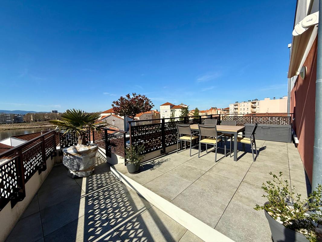 Une exceptionnelle terrasse de près de 40 m², accessible directement depuis le séjour, offrant une vue dégagée sur les bords de Loire.