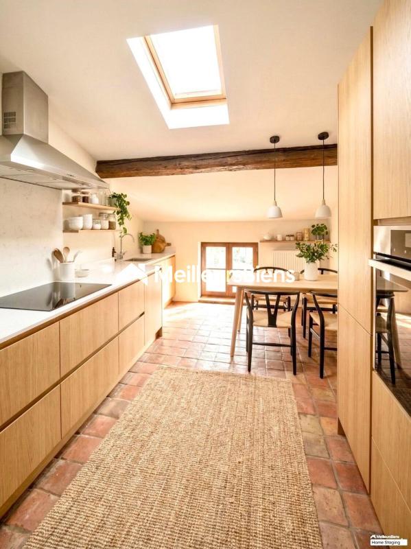Il se compose d'une entrée avec dégagement en tomettes, ouvrant sur une pièce de vie lumineuse d'environ 33 m² et une cuisine indépendante, entièrement meublée, alliant charme et authenticité, avec poutre apparente et sol en tomettes anciennes.