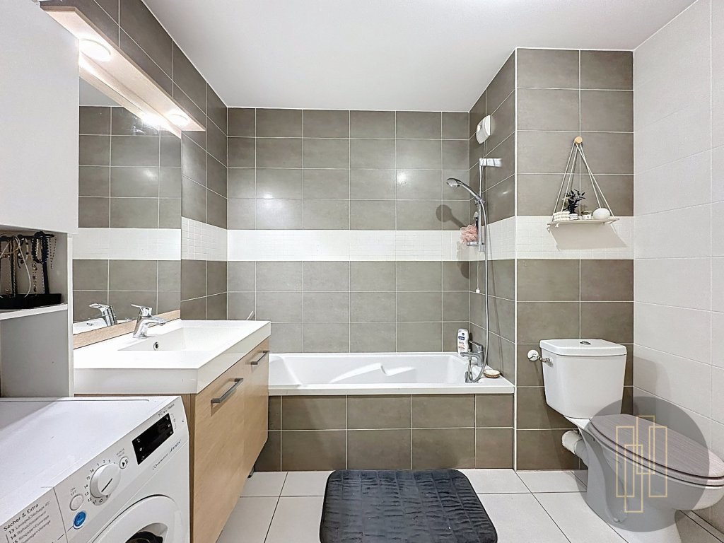 L'espace jour se compose d'un séjour ouvert sur une cuisine aménagée, créant un volume fluide et convivial propice à la vie quotidienne. La chambre, calme et bien isolée des espaces de vie, bénéficie d'un accès direct à une salle de bains équipée avec WC, assurant confort et fonctionnalité.