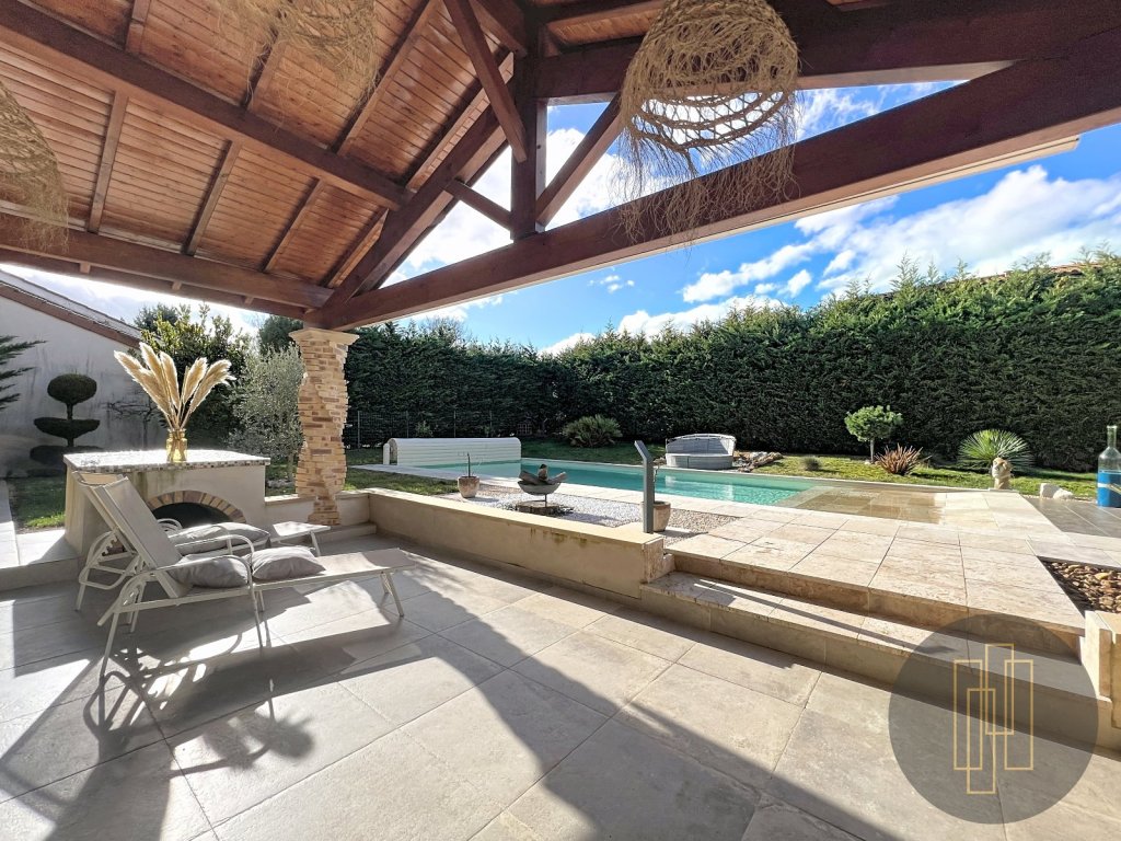 Cette belle pièce s'ouvre sur une terrasse couverte, véritable extension de l'espace de vie, offrant une agréable vue sur la piscine.
