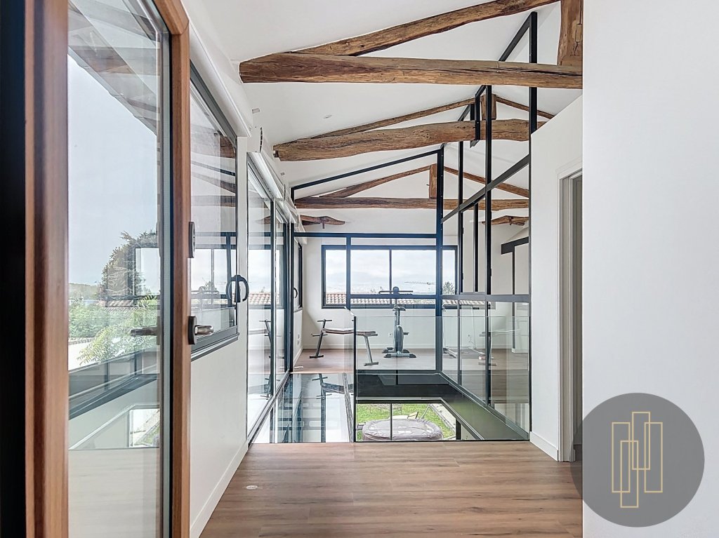 La cuisine ouverte et la pièce de vie spacieuse offrent un cadre idéal pour recevoir. À l'étage, une mezzanine vitrée spectaculaire surplombe le salon et baigne toute la maison de lumière naturelle, tout en mettant en valeur les poutres apparentes et la structure métallique du lieu.