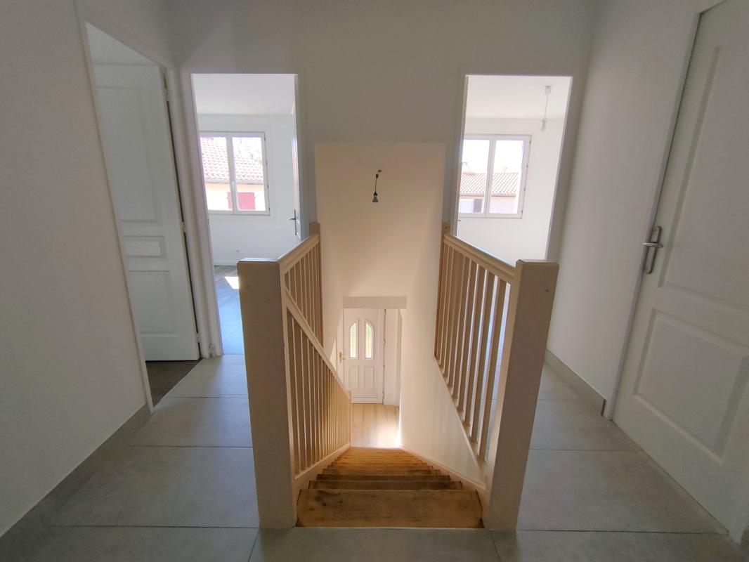 À l'étage, l'espace nuit se compose de trois chambres, d'une salle de bains, de WC séparés ainsi que d'un espace de rangement pouvant facilement être aménagé en dressing.