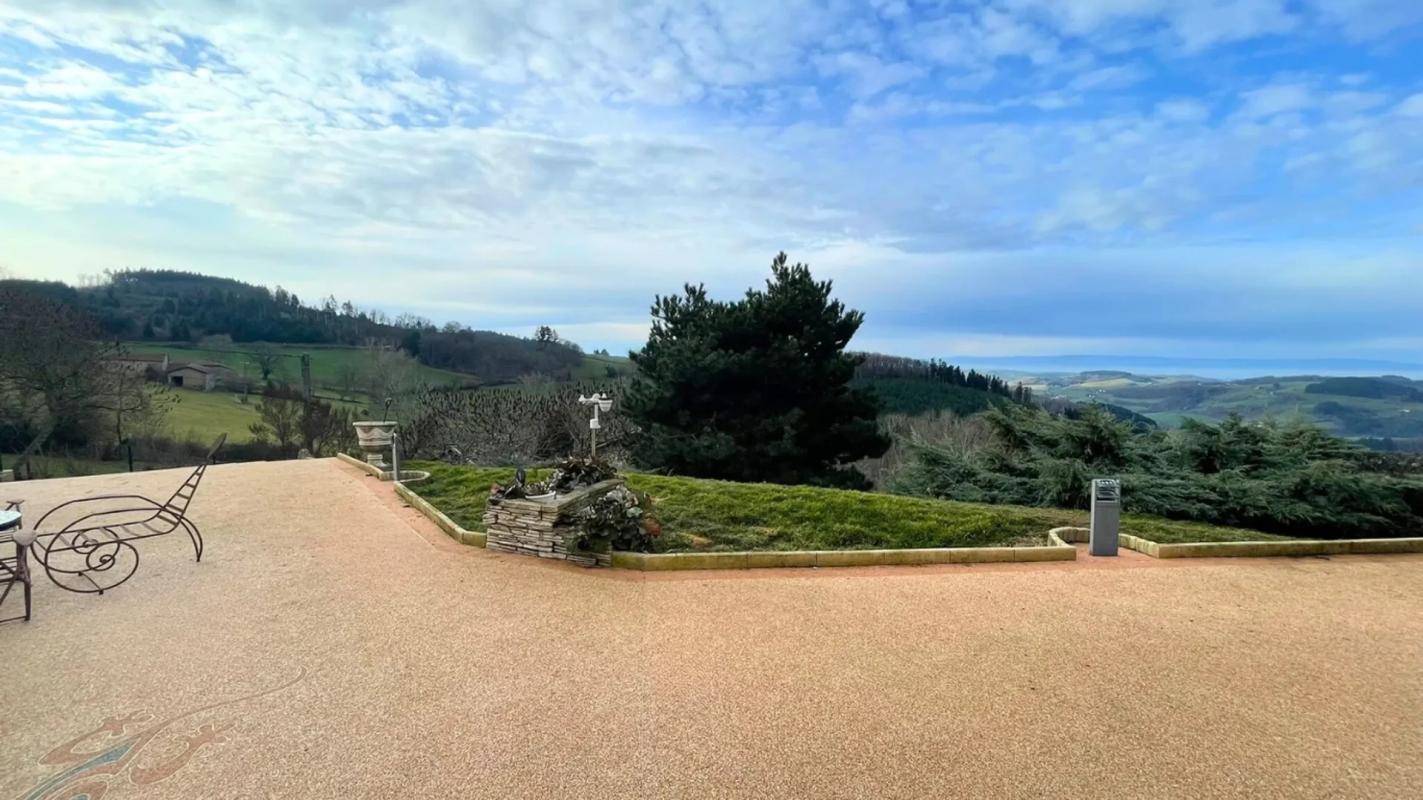 Maison individuelle de 172 m² sur les hauteurs de Thizy, comprenant 4 chambres dont 2 à l'étage. Très grand salon lumineux avec cheminée, cuisine moderne ouverte et grande véranda apportant volume et lumière. Terrasse avec vue dégagée. Une salle de bain et un WC sont présents à chaque étage. Garage, cellier, cave et petite dépendance complètent l'ensemble. Terrain d'environ 5 000 m² offrant de beaux extérieurs et un cadre calme. Maison très bien notée en performance énergétique, équipée de panneaux solaires générant un revenu complémentaire. Proche commerces, écoles et gare d'Amplepuis, à environ 1h15 de Lyon.