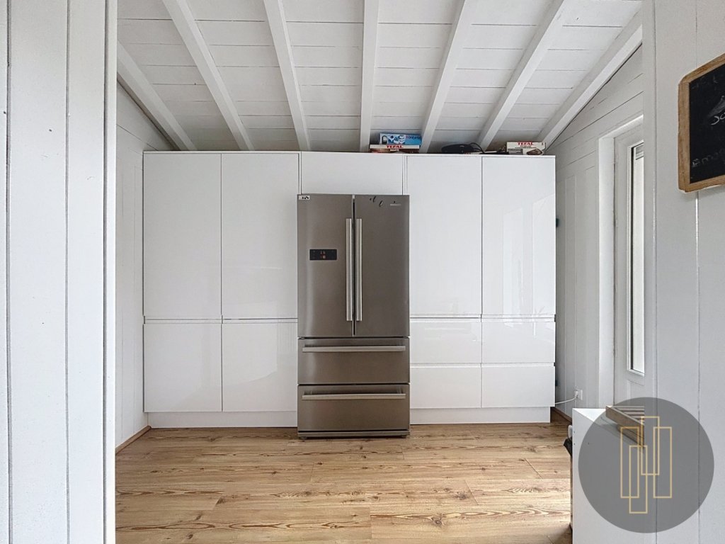 À l'étage, vous trouverez un salon lumineux, ouvert sur la cuisine, donnant directement sur la terrasse, parfaite pour profiter des journées ensoleillées. Vous y découvrirez également deux chambres et une salle de bains avec baignoire.
