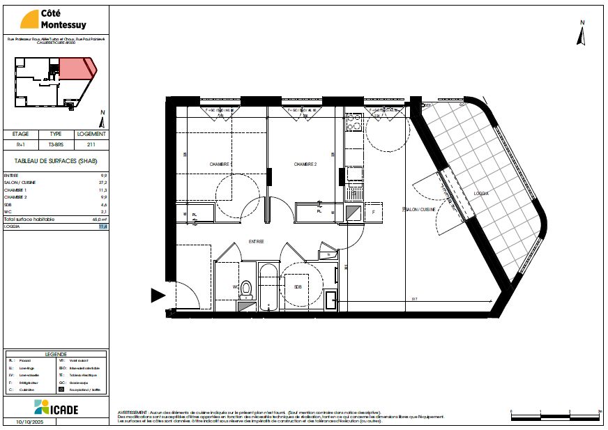 Ce T3 de 65 m² (lot 211) au premier étage est exposé Nord-Est et offre une entrée spacieuse, des WC séparés, une salle de bains avec baignoire et deux chambres spacieuses avec placard.