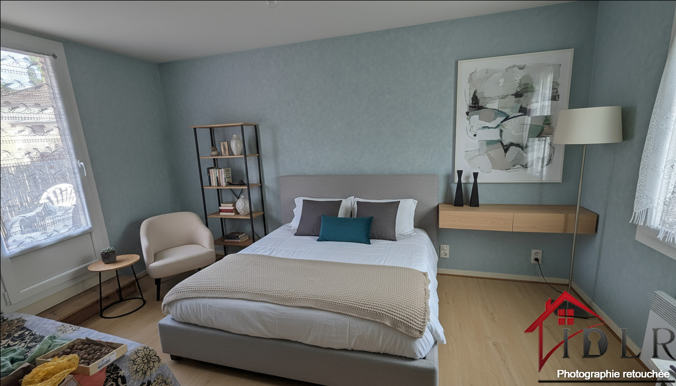 Étage : Deux chambres de 13 m2 avec placards, chacune donnant accès à un balcon exposé plein sud. Salle de bain avec baignoire, sèche-serviettes et WC.