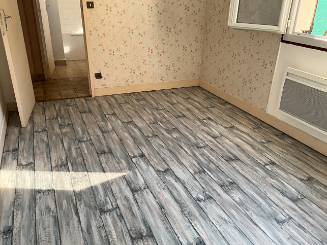 Un couloir desservant : une cuisine, un e pièce à vivre, une chambre, une salle de bain, wc séparés.