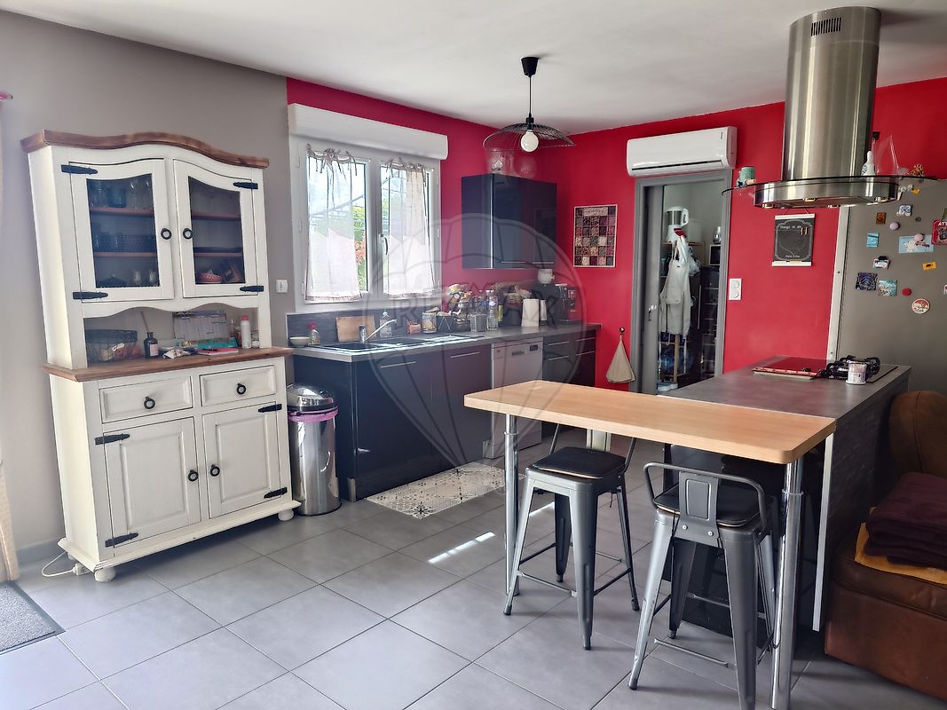 Maison de constructeur de 2015 de 104 m² habitable sur deux niveaux comprenant au rdc : grand séjour lumineux sur cuisine ouverte intégrée et équipée (plaque, hotte, four, lave vaisselle), cellier avec espace buanderie et local technique, salle d'eau, wc séparé, deux chambres avec placards.