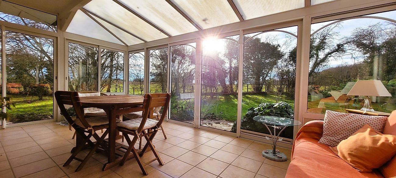 Dès l'arrivée, cette propriété dégage une atmosphère chaleureuse et apaisante. L'entrée, spacieuse et fonctionnelle, dessert un vaste salon-séjour baigné de lumière, sublimé par une belle cheminée, offrant un accès direct à une superbe véranda avec une vue dégagée sur le parc. Un véritable espace de vie où intérieur et extérieur se prolongent naturellement.