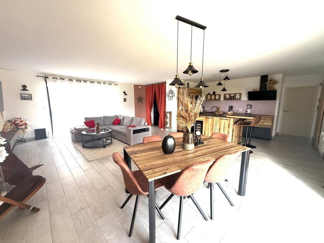 À l'intérieur, la maison de plain-pied se compose d'une entrée, d'un double séjour lumineux, d'une cuisine ouverte entièrement équipée, deux salles d'eaux, de deux toilettes, de quatre chambres dont une suite parentale avec dressing et salle d'eau privative. Un cellier et un accès au garage complètent ce bien moderne et fonctionnel, idéal pour une famille.