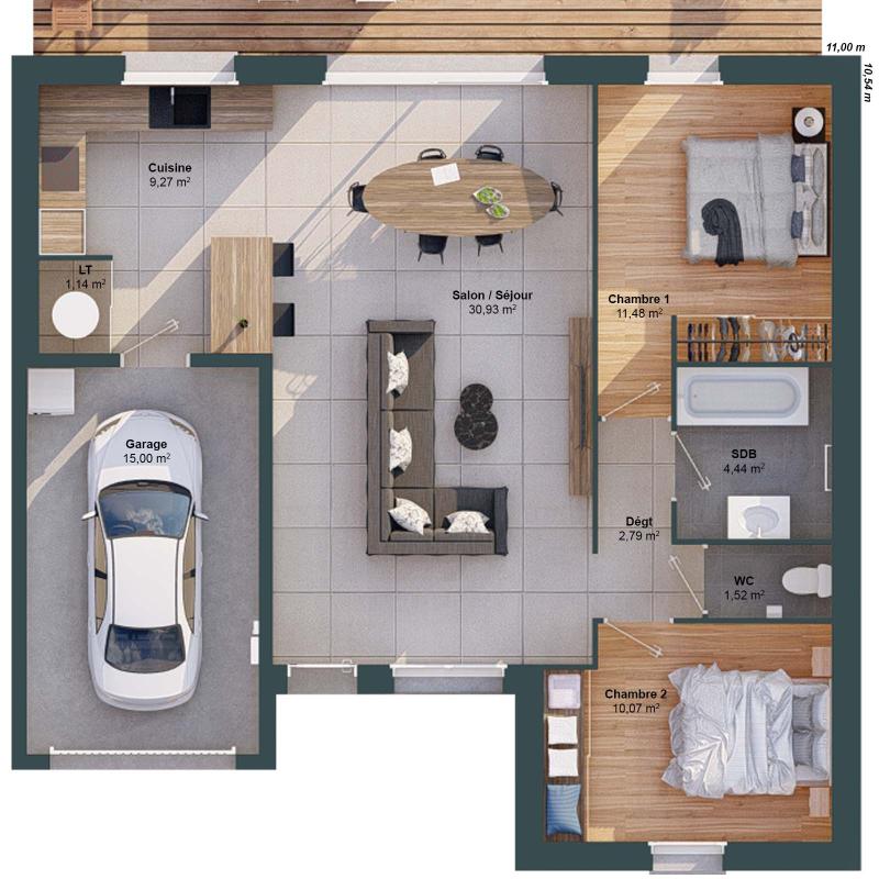 Cette maison de 2 chambres offre une superficie initiale de 71 m2 habitable avant agrandissement. Elle propose une pièce de vie de 40 m2 évolutive selon vos besoins et vos souhaits.