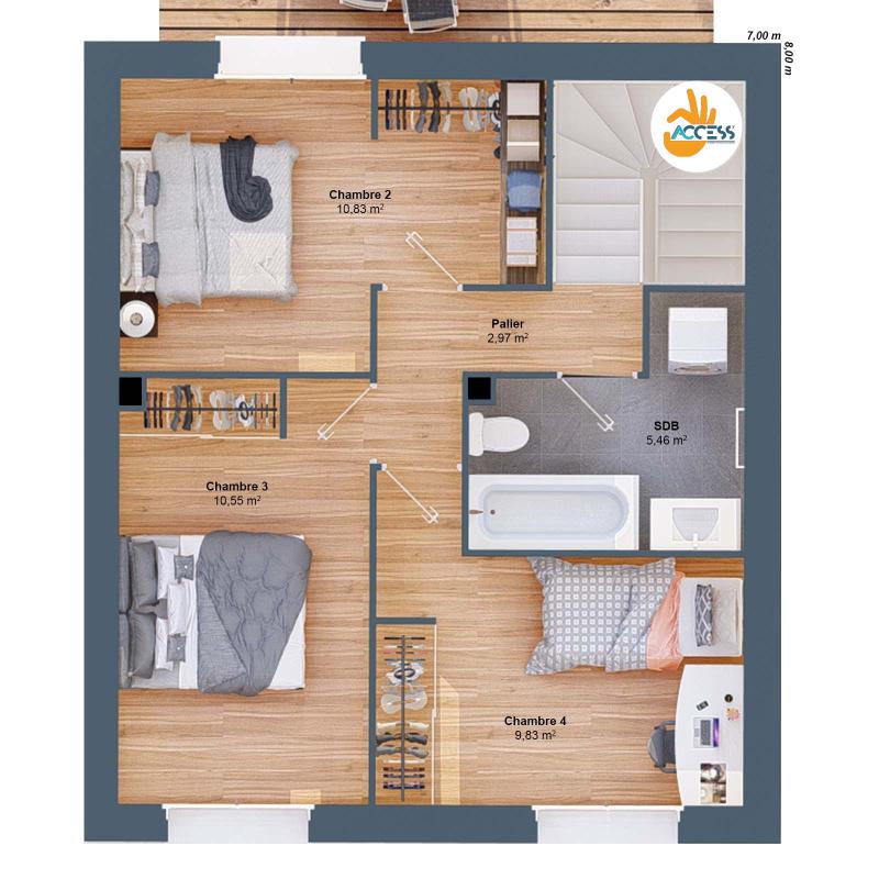Cette maison de 4 chambres offre une distribution des pièces optimisée. Elle propose une pièce de vie confortable et trois belles chambres à l'étage dont une suite parentale avec son dressing. Son plus : une chambre au rez-de-chaussée, une pièce polyvalente au service de la famille qui s'adapte à vos besoins… chambre parentale, chambre d'amis, bureau ou encore salle de jeu pour les enfants. Ce plan a été pensé pour faciliter l'accès à la propriété à un budget maîtrisé.