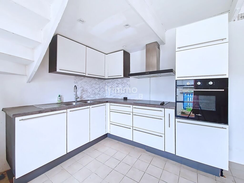 Rez-de-chaussée : cuisine aménagée et équipée de base, ouverte sur un salon-séjour lumineux exposé sud.