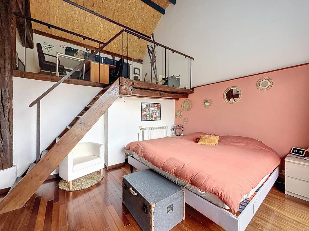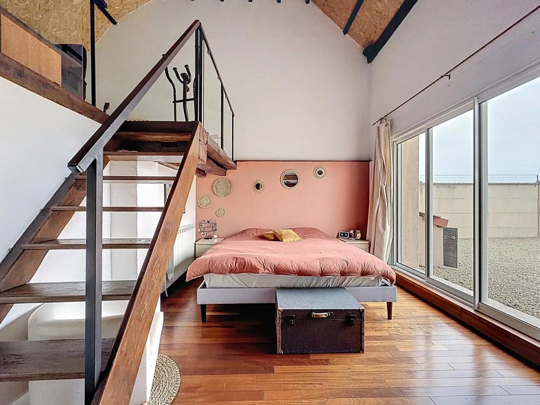 Un premier accès depuis la pièce de vie mène à une mezzanine pouvant accueillir une salle de jeux, ainsi qu'à une chambre.