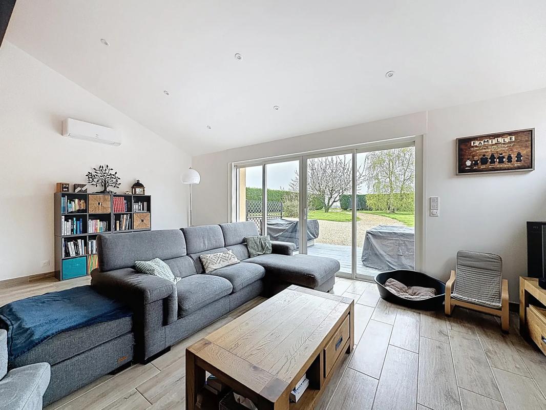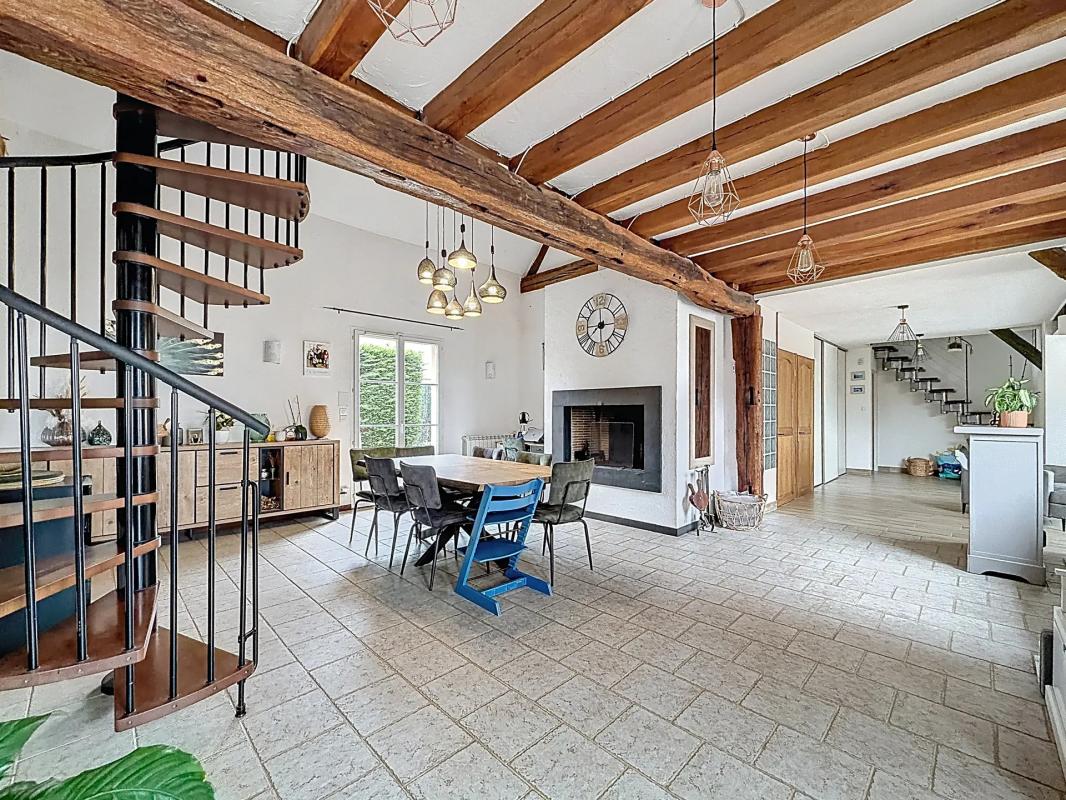 L'entrée ouvre sur une spacieuse salle à manger avec cheminée, véritable pièce centrale de la maison. Dans son prolongement, une cuisine aménagée et ouverte avec arrière-cuisine offre un espace fonctionnel et convivial. Un double salon lumineux, grâce à sa baie vitrée à galandage, permet un accès direct vers l'extérieur.
