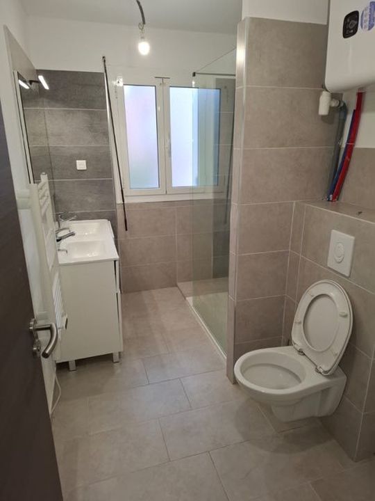 Location appartement F3 vide situé à Borgo (20mn sud Bastia), 75m² environ en résidence calme, quatrième étage sans ascenseur, entièrement rénové récemment, lumineux, traversant, composé d'une cuisine séparée équipée (plaque, four, hotte, réfrigérateur), de deux chambres avec rangements et d'une salle de douche, débarras, doubles-vitrages, climatisation (salle + desserte), deux grands balcons (est/ouest), vue mer, parking, proche commodités, disponible fin mars.