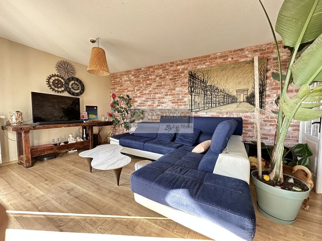 Un grand salon -séjour d'une superficie de 32 m² en L avec accès à la terrasse par de grandes baies vitrées ( véritables pierres au mur dans le salon).