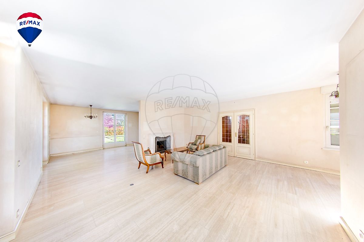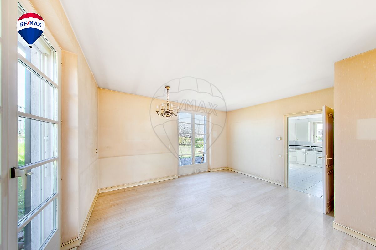L'entrée dévoile immédiatement le caractère de la maison. Le grand salon-séjour est le véritable point fort du rez-de-chaussée : spacieux, lumineux, agrémenté d'une cheminée avec insert et d'un bow-window arrondi qui inonde la pièce de lumière naturelle sur trois côtés. L'ambiance est chaleureuse et bourgeoise. La salle à manger communicante s'ouvre directement sur le jardin via de larges portes-fenêtres. La cuisine équipée, bien proportionnée, dispose d'un accès indépendant sur l'extérieur. Le rez-de-chaussée comprend également un vestiaire, un WC séparé et un double garage attenant.