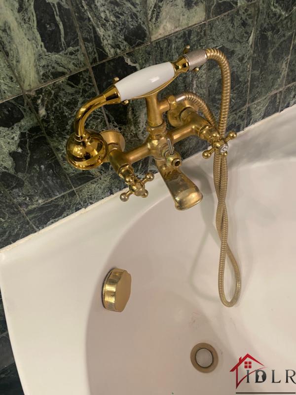 Vous serez sous le charme de la salle de bain, avec son marbre vert et sa robinetterie dorée, qui apportent une touche de sophistication et d'élégance, les deux vasques et la baignoire d'angle confortable et spacieuse en font un lieu à la fois esthétique et pratique grâce à ses grands placards. Une petite salle de douche est également présente un peu plus loin dans l'appartement.