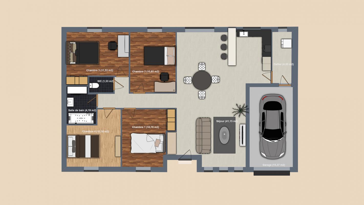 Une ligne sobre pour ce plain-pied de 100 m². Le modèle Aphrodite est idéal pour la vie de famille. Le garage possède un accès direct au cellier attenant à la cuisine ouverte sur un grand séjour dans un esprit de fonctionnalité.