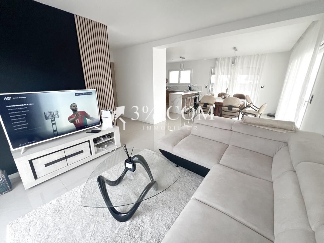 Une vaste pièce de vie baignée de lumière, composée d'un salon-séjour et d'une cuisine entièrement équipée, ouverte sur la terrasse grâce à de larges baies vitrées