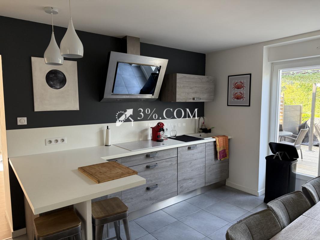 Le niveau principal de la maison se compose d'une belle entrée donnant accès sur les toilettes, l'espace séjour/bureau et la lumineuse cuisine équipée dont bénéficie la maison avec vue et accès direct à la terrasse sur pilotis de 25 m2 exposée plein sud.