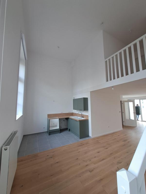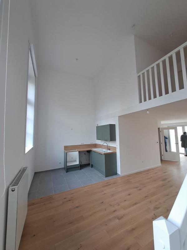 Cet appartement est situé au 1er étage avec ascenseur. L'espace cuisine dispose d'un plafond cathédrale donnant sur la mezzanine de l'étage.