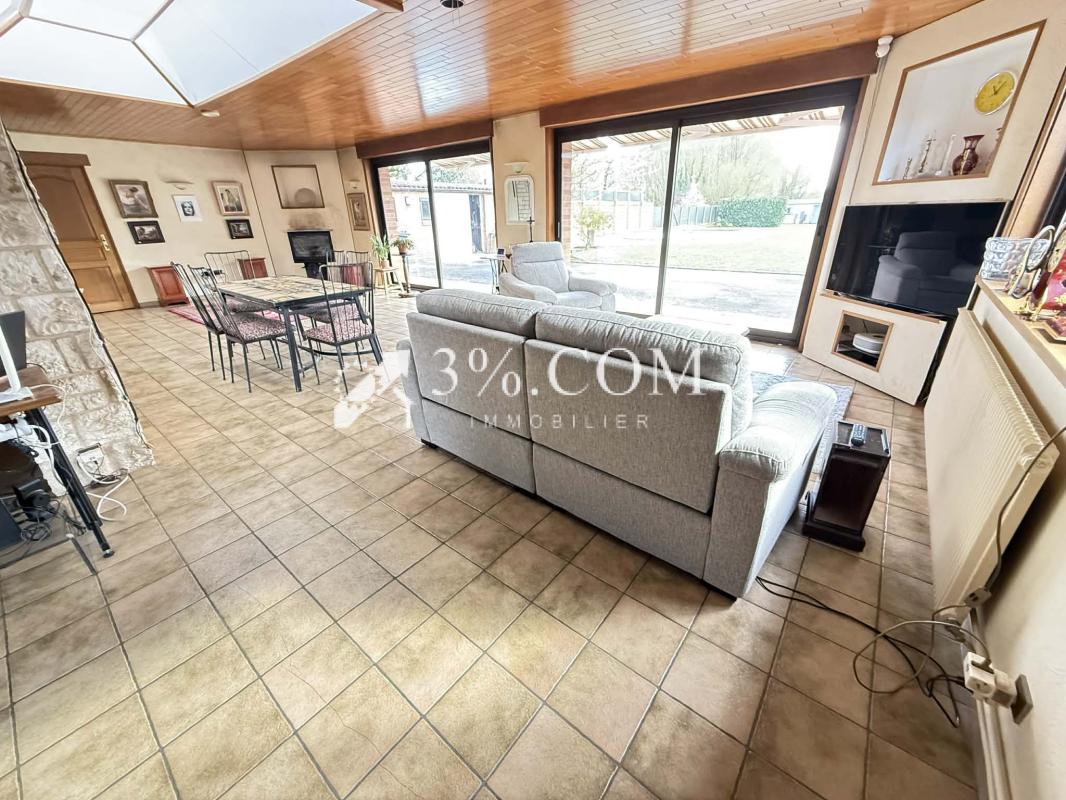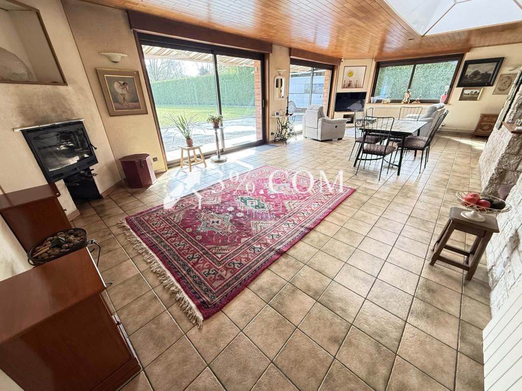 Grande pièce de vie de plus de 85 m2 avec baies sur le jardin et cheminée de feu de bois avec insert