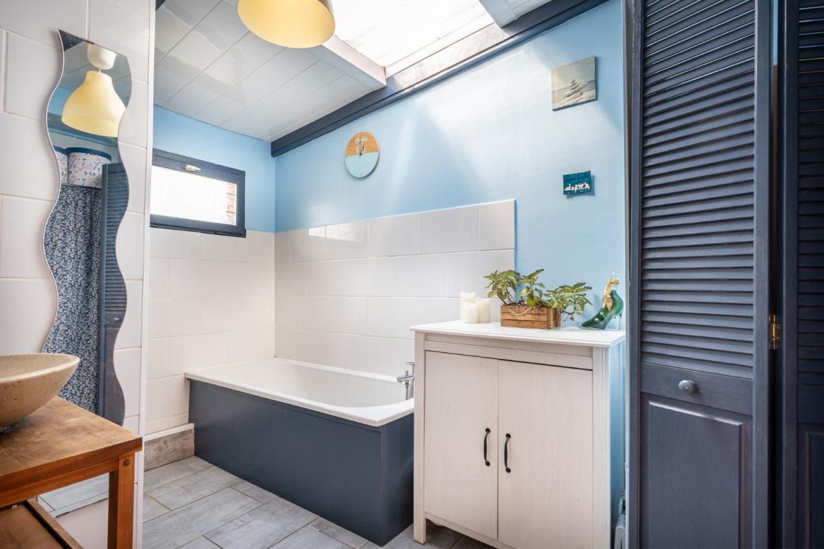 La pièce de vie s'ouvre sur une cuisine lumineuse, mise en valeur par une grande baie vitrée et un puits de lumière. L'ensemble forme un espace convivial, adapté au quotidien comme aux moments partagés. La salle de bains, elle aussi baignée de lumière grâce à un puits de lumière, combine douche et baignoire. Une buanderie pratique et une cave complètent les annexes du rez-de-chaussée.