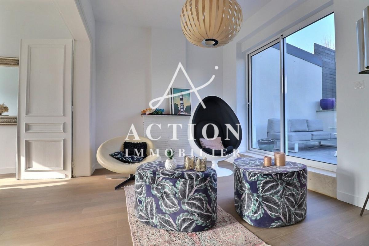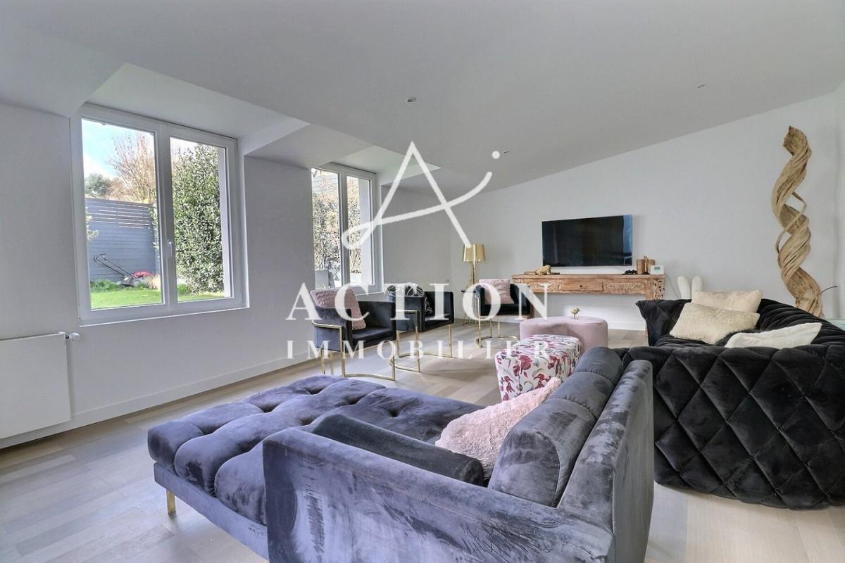 Au rez-de-chaussée, vous trouverez un hall d'entrée desservant un premier séjour très lumineux et traversant, une belle cuisine équipée avec un coin repas. Vous profiterez également d'un deuxième salon donnant sur le jardin et sur un patio !
