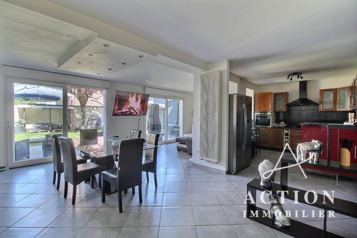 La pièce de vie de 50m² se compose d'une cuisine, d'un salon et d'une salle à manger lumineuse grâce à ses baies vitrées donnant sur un très jolie jardin de 120m² sans vis-à-vis.