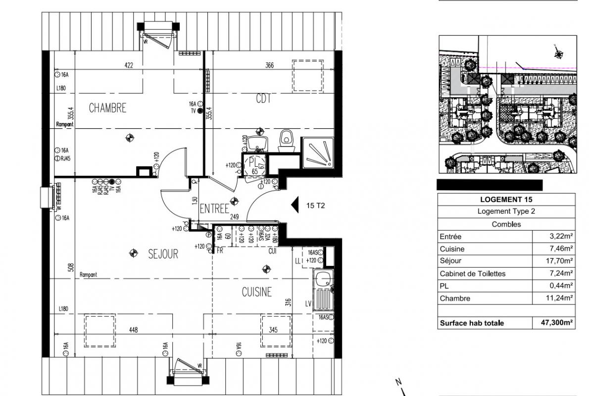 Il dispose d'une entrée avec placard, salle de bain avec douche et WC, un grand séjour lumineux avec cuisine ouverte et une chambre spacieuse.