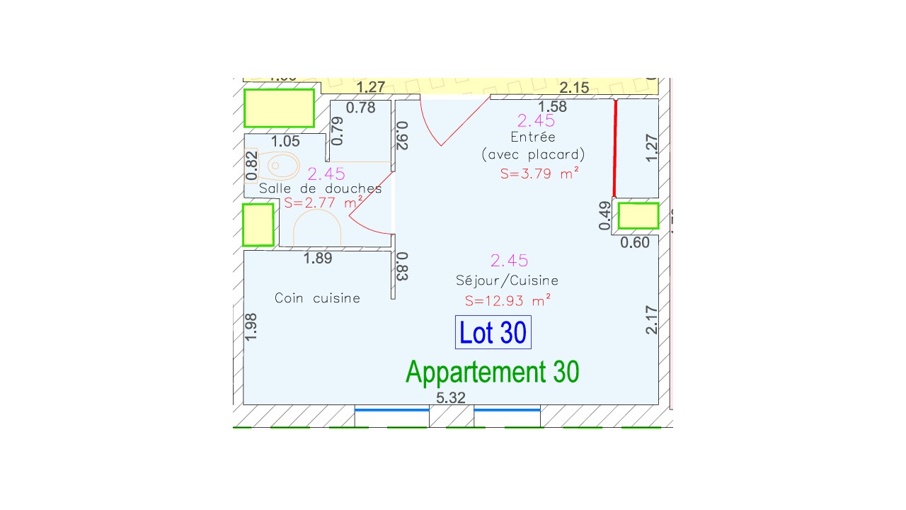 Situé au 2ème étage appartement de type 1bis d'une superficie de 19 m² environ comprenant : entrée, séjour avec coin cuisine, salle d'eau avec WC. Menuiseries double vitrage.