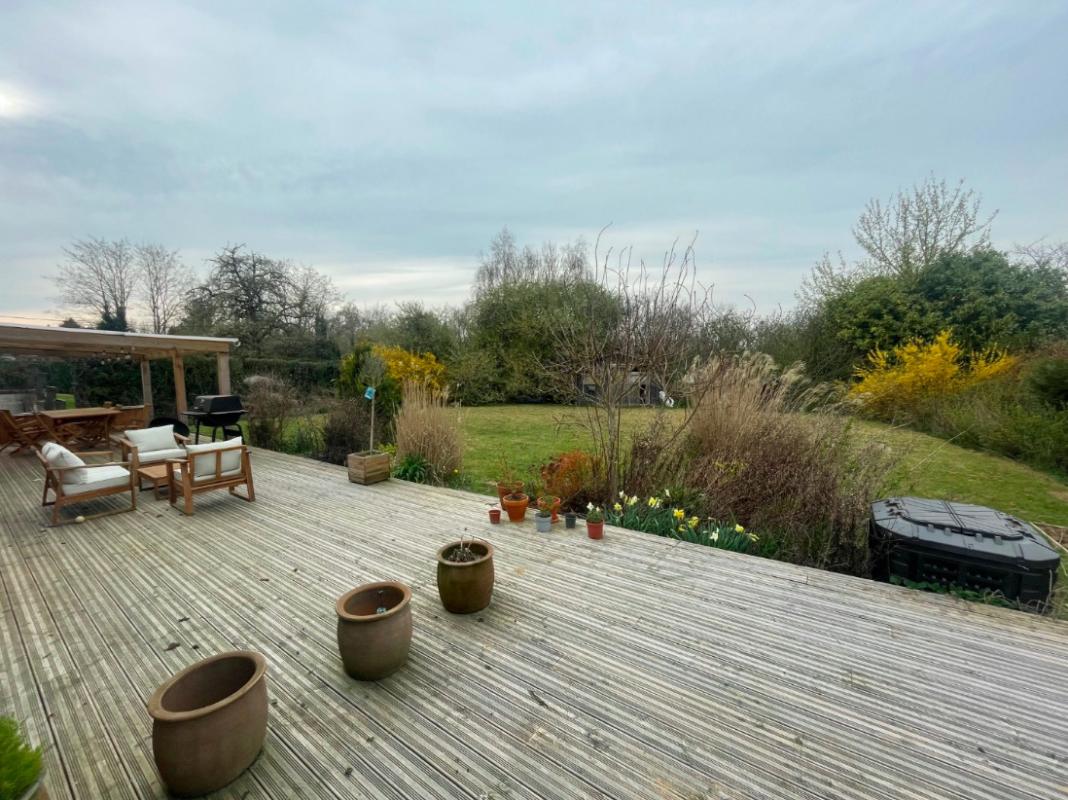 Grande terrasse avec pergola, jardin arboré et double garage.