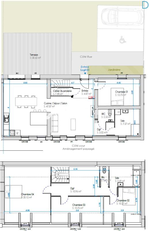 Ce bien de 132m2 se compose au RDC d'une entrée, un vaste salon séjour de 47m2, un cellier, une chambre ainsi qu'une salle d'eau et un WC aux normes PMR.