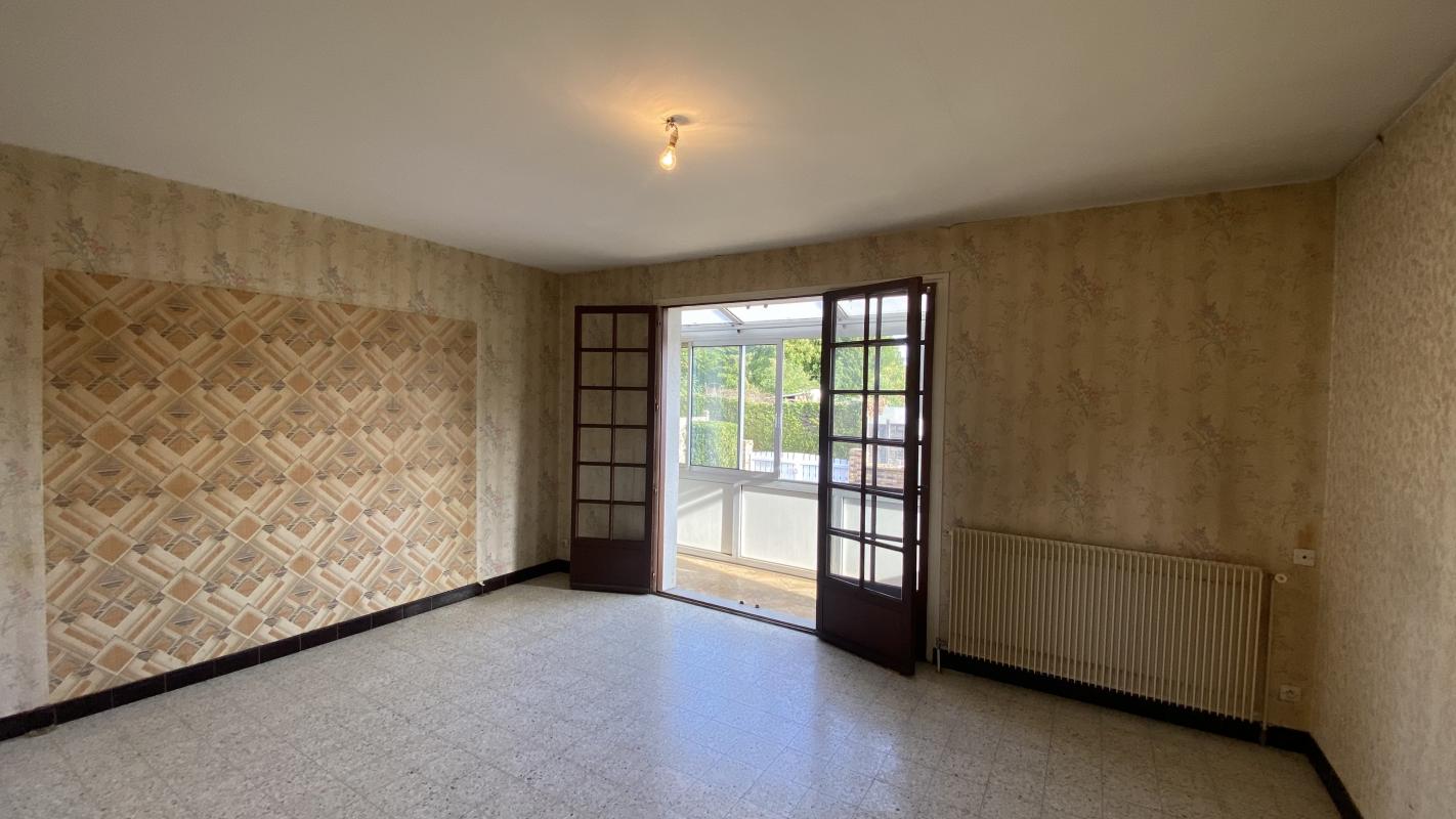 Une entrée donnant sur un séjour lumineux et un espace véranda, une cuisine aménagée, une salle de bain avec WC séparé et 2 chambres.