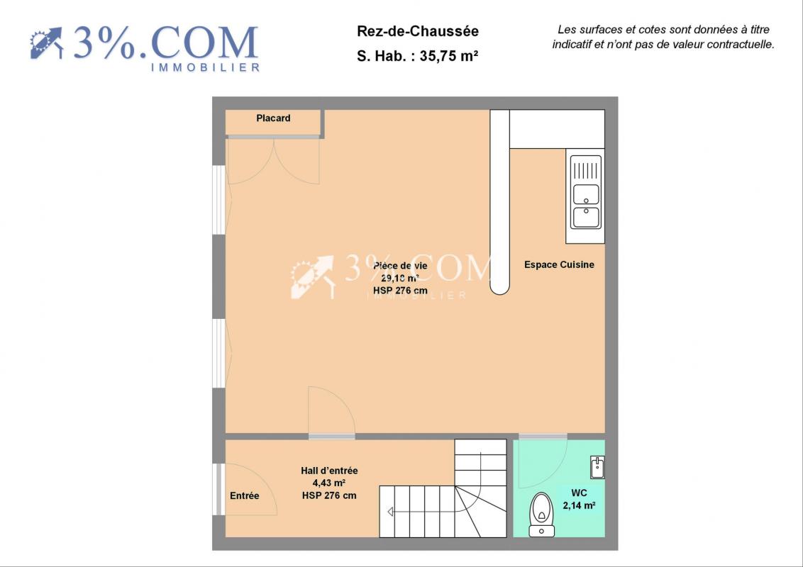 ***RDC : Hall d'entrée _ Pièce de vie avec cuisine équipée (29 m2) _ 1 WC