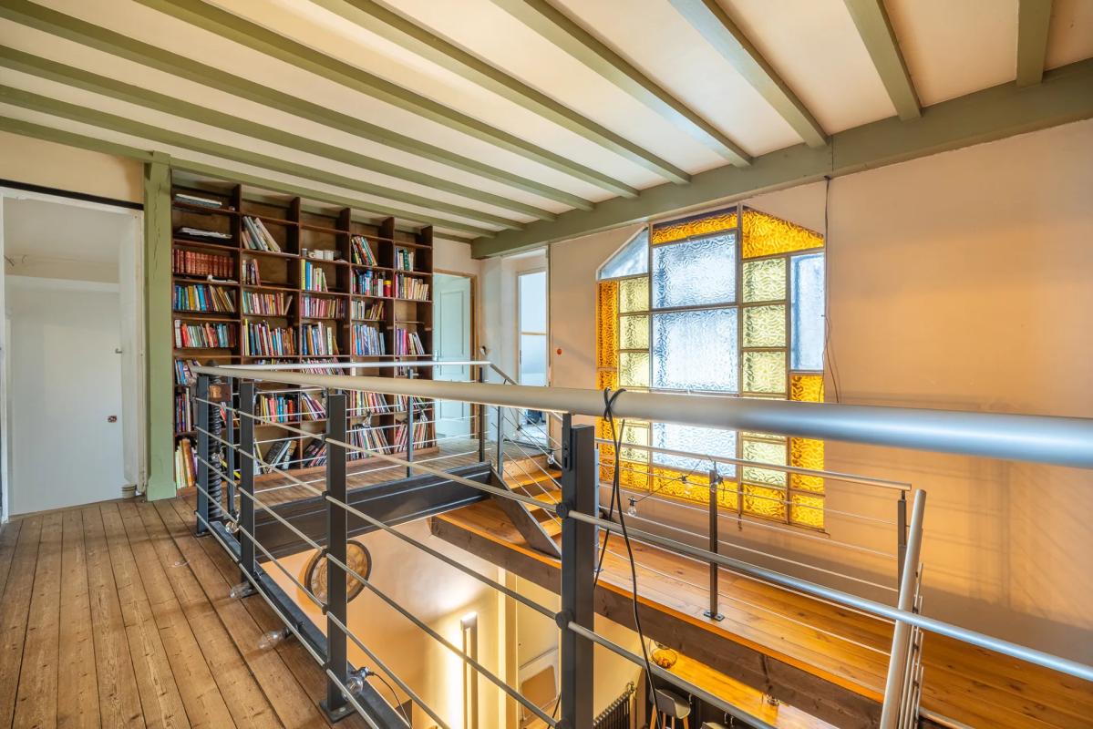 À l'étage, trois chambres lumineuses vous attendent, dont l'une avec une terrasse privative, parfaites pour accueillir toute la famille. Une salle d'eau moderne avec douche à l'italienne et WC, ainsi qu'une coursive agrémentée de bibliothèques et de vitraux, ajoutent charme et fonctionnalité à cet espace nuit.