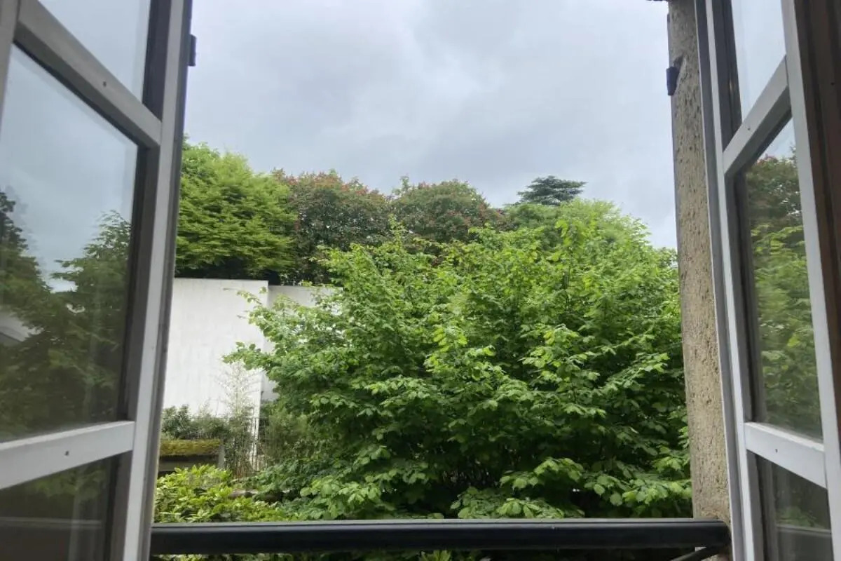 Vitrine et 2 fenêtres donnant sur une allée dégagée et calme.