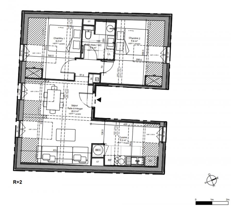 L'appartement offre un séjour spacieux, une cuisine séparée de 9 m², deux chambres et une salle de bain.