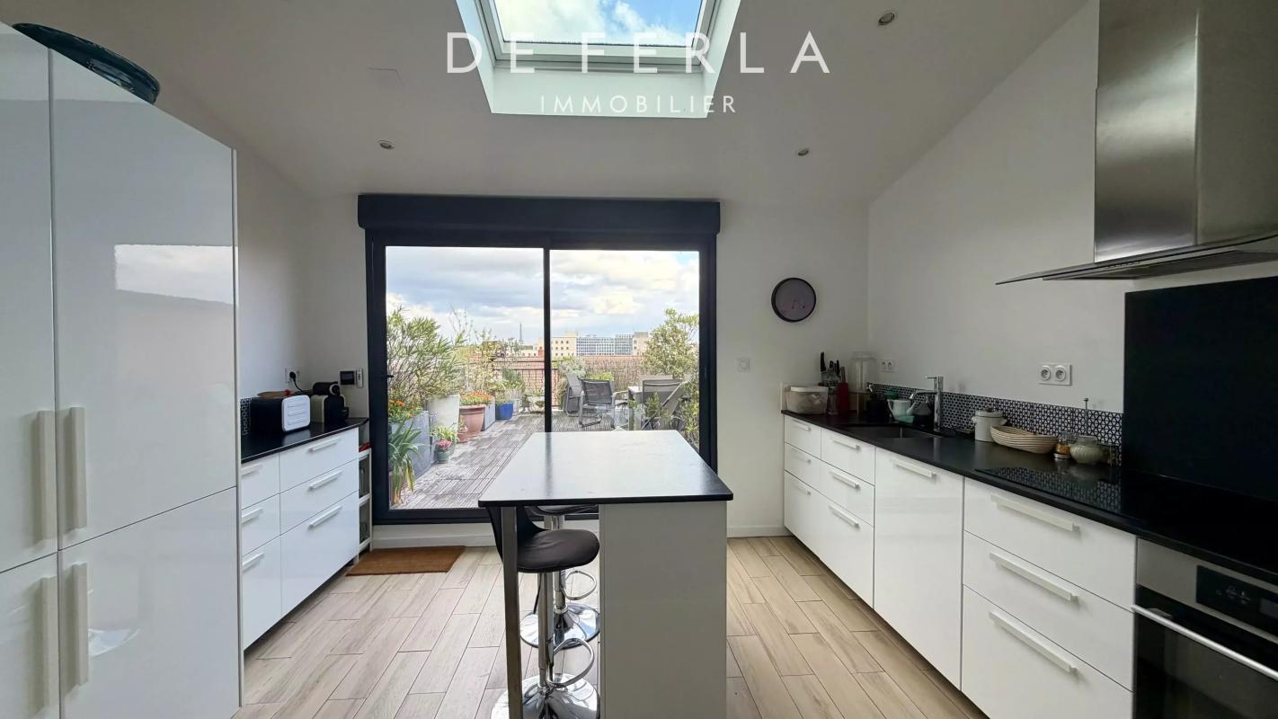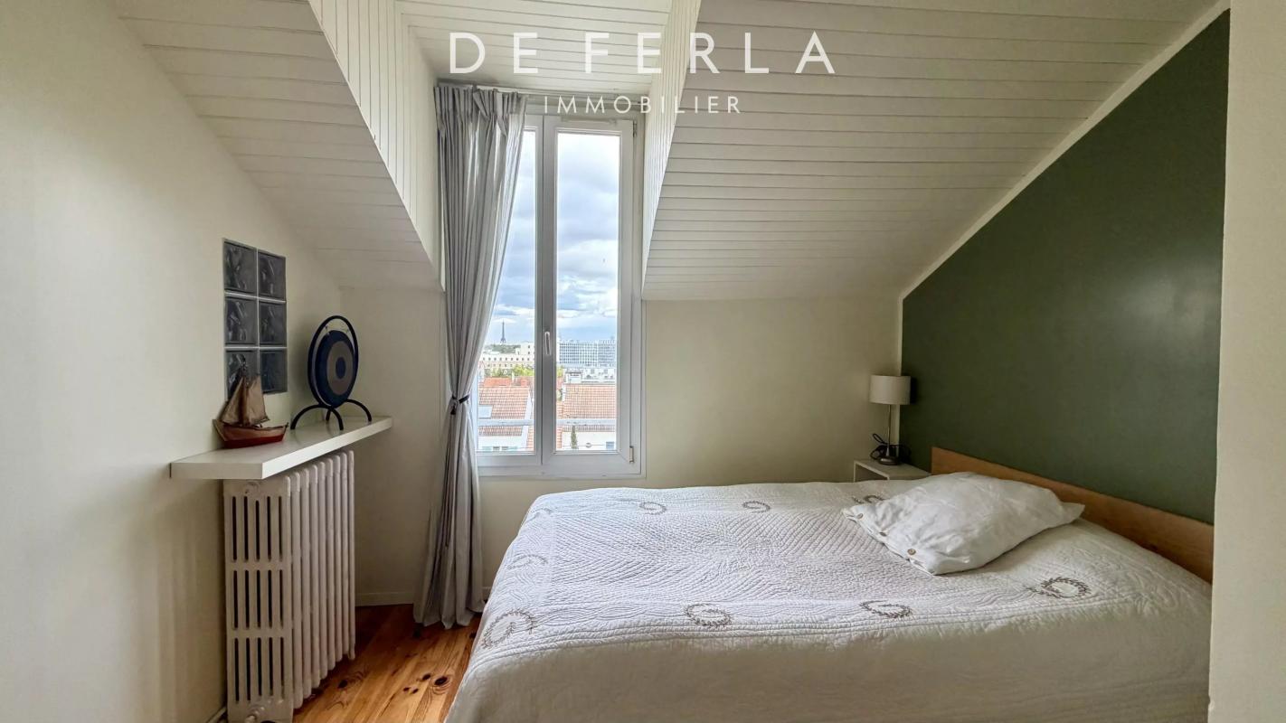 L'espace principal (85 m² Carrez, duplex) comprend un séjour de 40 m² avec cuisine ouverte donnant sur une terrasse plein ciel orientée Est, sans vis-à-vis, avec vue sur la Tour Eiffel. Un bureau, WC invités, deux chambres, salle de bains et WC à l'étage.