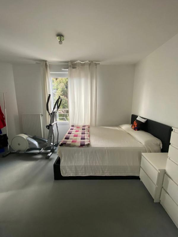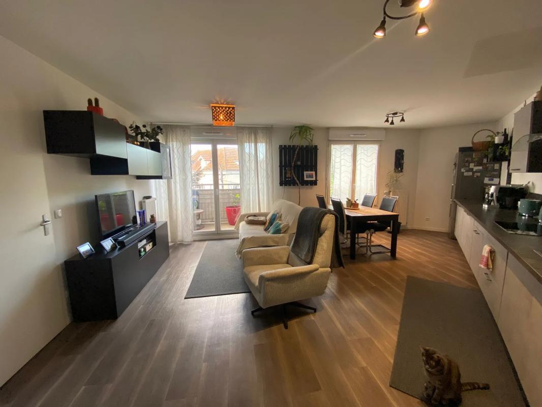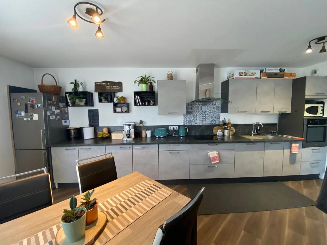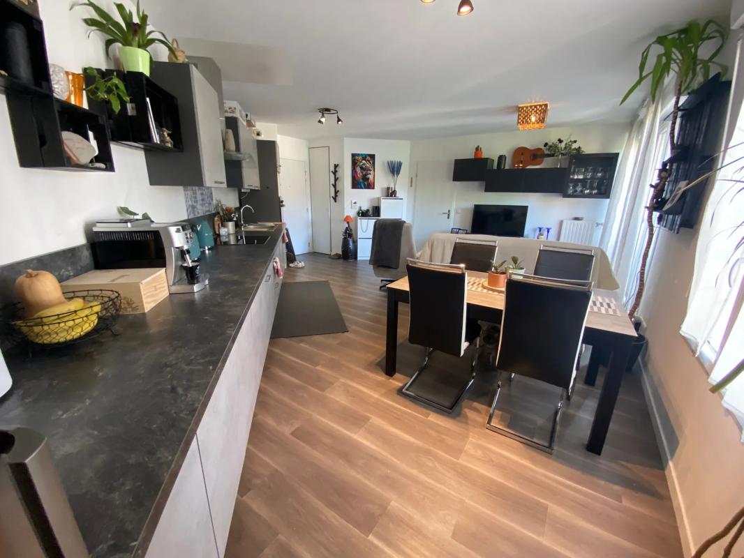 La cuisine aménagée est bien intégrée dans cet espace de vie, créant une vraie continuité entre la partie repas et le coin salon. L'ensemble est lumineux, grâce aux ouvertures donnant sur l'extérieur et à la configuration de la pièce qui laisse circuler la lumière. L'appartement dispose de deux chambres de belles dimensions, offrant des volumes confortables pour un couple, une petite famille ou un bureau à domicile.