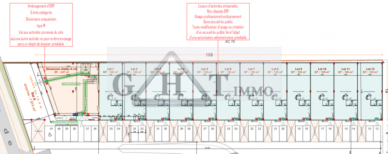 Caractéristiques : — 12 lots de 126 m² + mezzanine 30 m² (bâtiment A : 1 512 m²) — Showroom 500 m² en façade — Hauteur : 7,50 m — Toiture végétalisée — Accès poids lourds — Parking : 2 places / lot + 1 livraison
