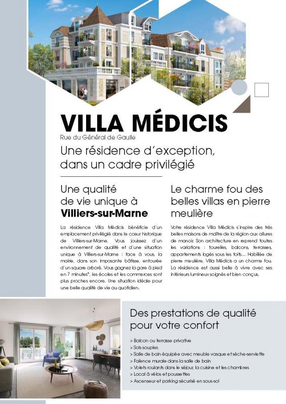 La résidence Villa Médicis bénéficie d'un emplacement privilégié dans le cœur historique de Villiers-sur-Marne. Vous jouissez d'un environnement de qualité et d'une situation unique à Villiers-sur-Marne : face à vous, la mairie, dans son imposante bâtisse, entourée d'un square arboré. Vous gagnez la gare à pied en 7 minutes*, les écoles et les commerces sont plus proches encore. Une situation idéale pour une belle qualité de vie au quotidien.
