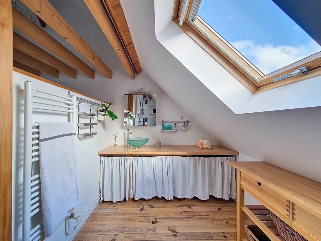 A l'étage, une pièces de vie de près de 80 m², divisible en 2 ou 3 chambres, salle de douche et WC séparés.