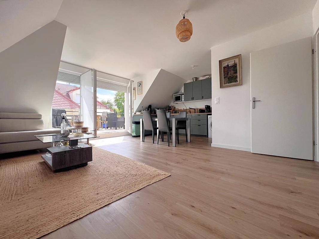 Entrée sur dégagement avec placard, pièce de vie avec cuisine US de 44 m² utiles (34 m² carrez) donnant sur terrasse, 2 chambres avec placards, salle de bains et WC séparés. Parking en sous-sol et parking visiteurs.