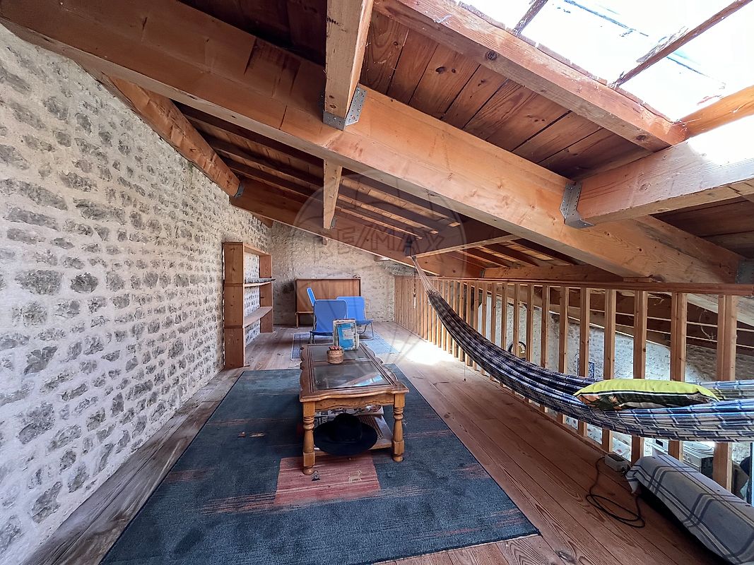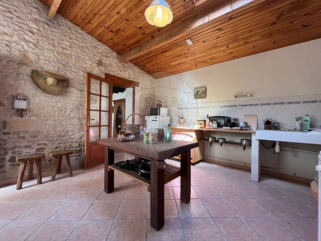 La maison se compose d'une véranda, d'un séjour avec cheminée, d'une cuisine, d'une salle d'eau avec WC, de deux chambres en enfilade à l'étage et d'une cave. Attenant à la maison, on trouve un grand chai rénové avec mezzanine offrant beaucoup de cachet, auquel on accède par la véranda. Il n'y a plus grand chose à faire pour le passer en habitable...Dans le prolongement du bâtiment, nous avons également une vaste grange (exploitée en garage) et une remise indépendante en très bon état. Chauffage via l'insert.
