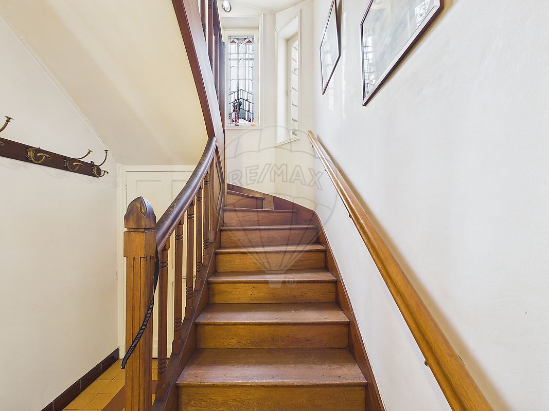 Au rez-de-chaussée, l'entrée dessert une cuisine indépendante avec petite arrière-cuisine, un WC séparé, ainsi qu'un salon baigné de lumière doté d'une cheminée ouverte et de vitraux, apportant du caractère à la pièce de vie.