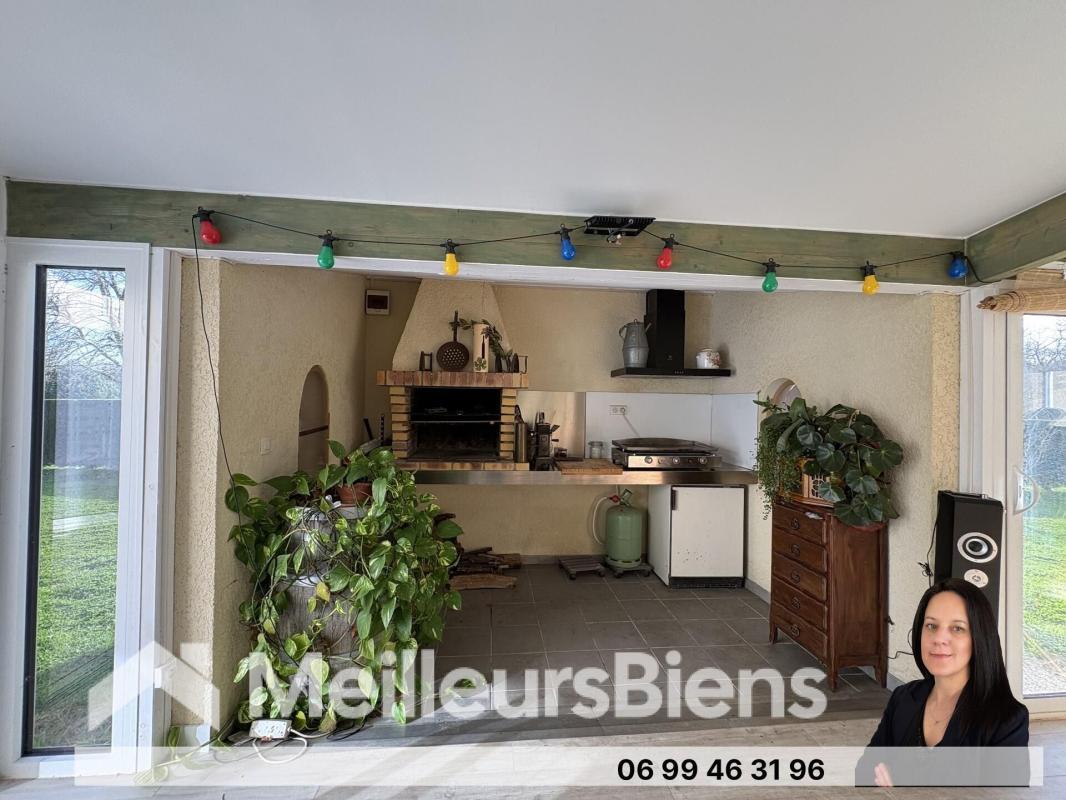 La véranda vient prolonger l'ensemble et abrite un coin cuisson couvert — pratique et convivial, quelle que soit la saison.